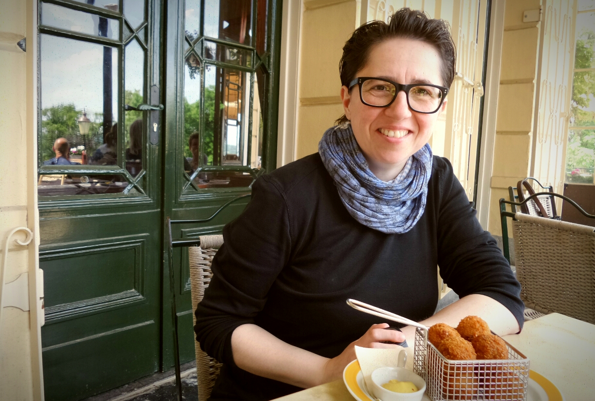 Als kleine Abkühlung und Stärkung – inzwischen war das Thermometer auf fast 30°C gestiegen und das Sönnchen lachte – stiegen wir zum Buitengoed Slavante auf. Von der Terrasse hat man einen herrlichen Blick auf die Maas und den kleinen Weinberg Slavante. Die Besichtigung der Grotten hatte allerdings schon angefangen, das kommt aber auf die Wiedervorlage (bis September kann man 5x täglich für 6,40 Euro eine Führung durch die Zonneberg-Grotten mitmachen). Und was isst man in den Niederlanden als Snack? Klaro, Bitterballen!