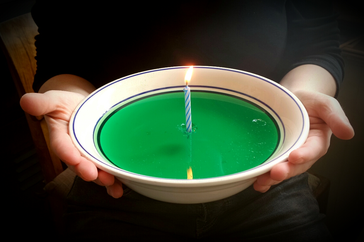 Als Einstimmung gab es zuerst einen „Geburtstagskuchen“ aus giftgrüner Götterspeise mit Waldmeister-Aroma und einem Kerzchen, wie schön!