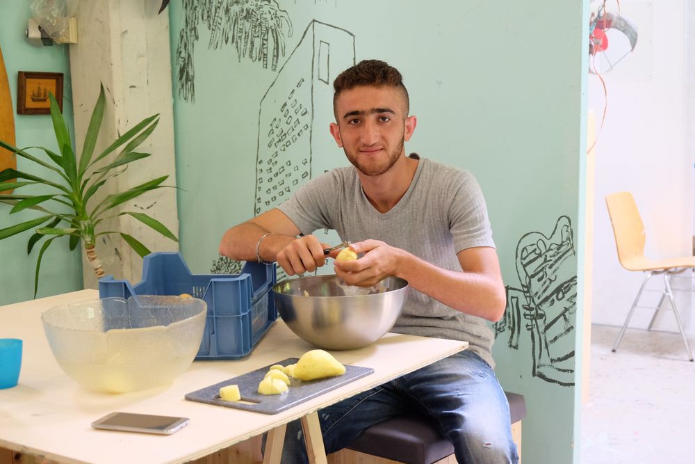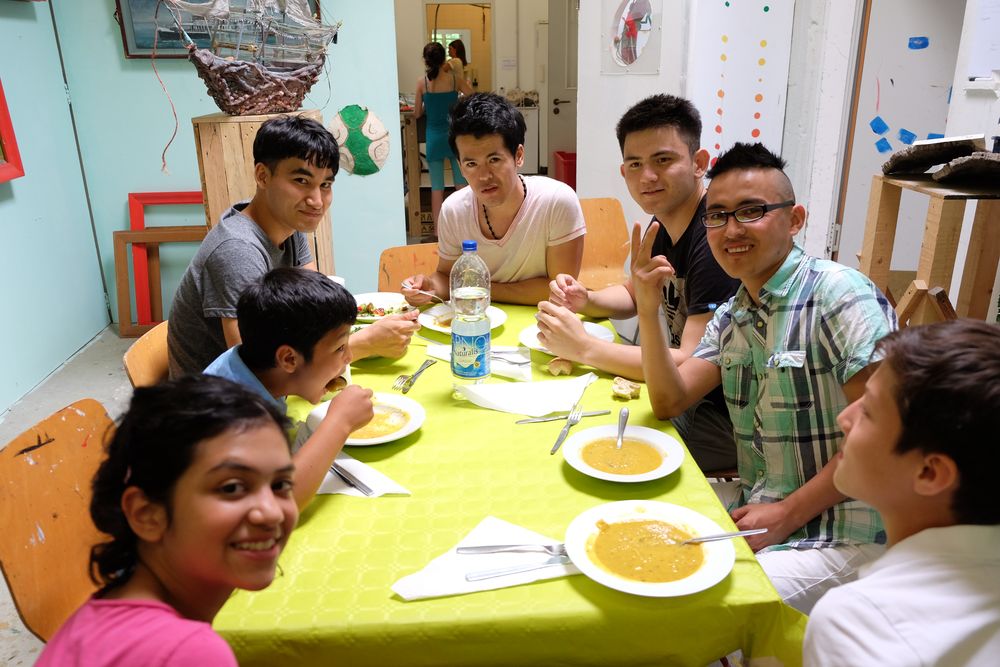 Der Klenkes ist unter die Köche gegangen: Beim Kunst-Koch-Projekt AHOI 3 von Vera und Ana Sous im Ludwig Forum haben Belinda Petri, Eileen Osthoff, Laura und Lilli für etwa 30 Jugendliche, meist unbegleitete minderjährige Flüchtlinge, gekocht. Ich war eigentlich nur als Fotografin dabei, musste aber nach einem kleinen Unfall mit scharfem Messer doch auch beim Schnibbeln einspringen.